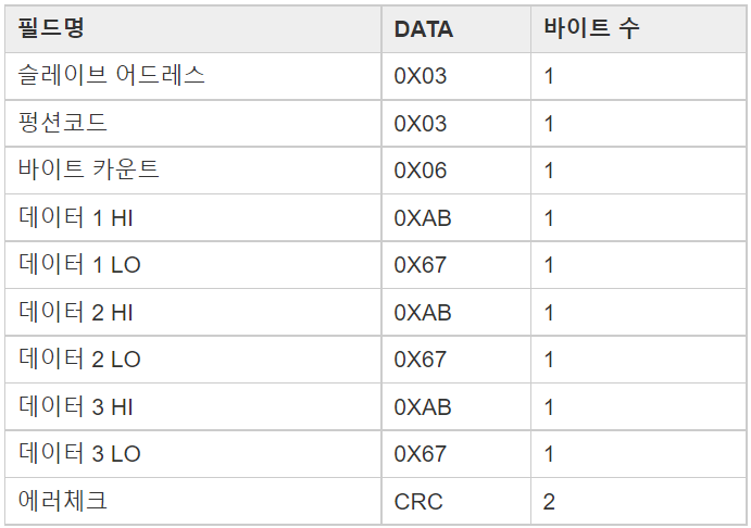 이에 대한 응답은 아래와 같습니다. 1 워드는 2 바이트이므로, 총 6 바이트의 데이터를 응답합니다.