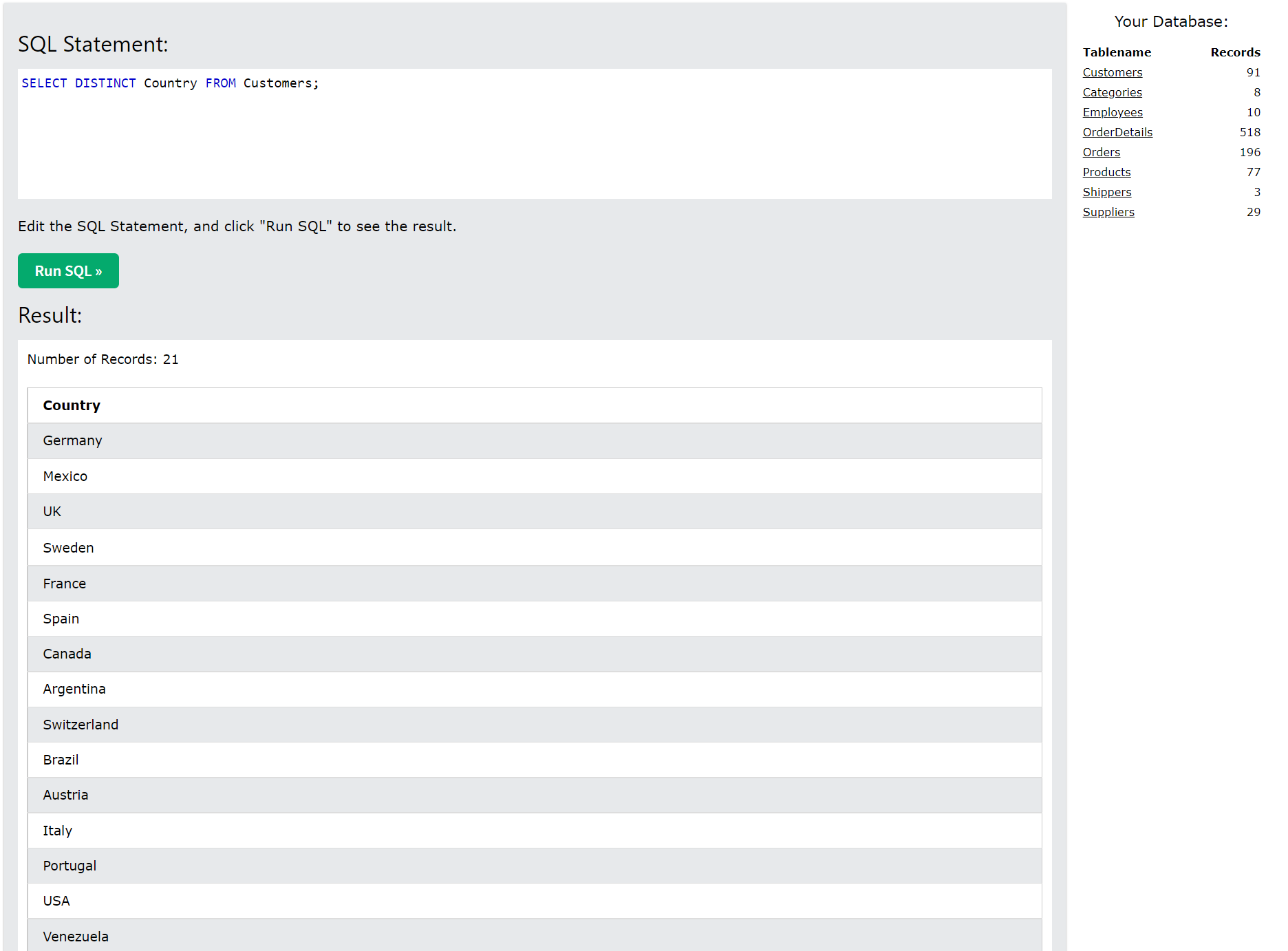 -> Customers 테이블의 Country 열에서 DISTINCT 값만 선택한다.