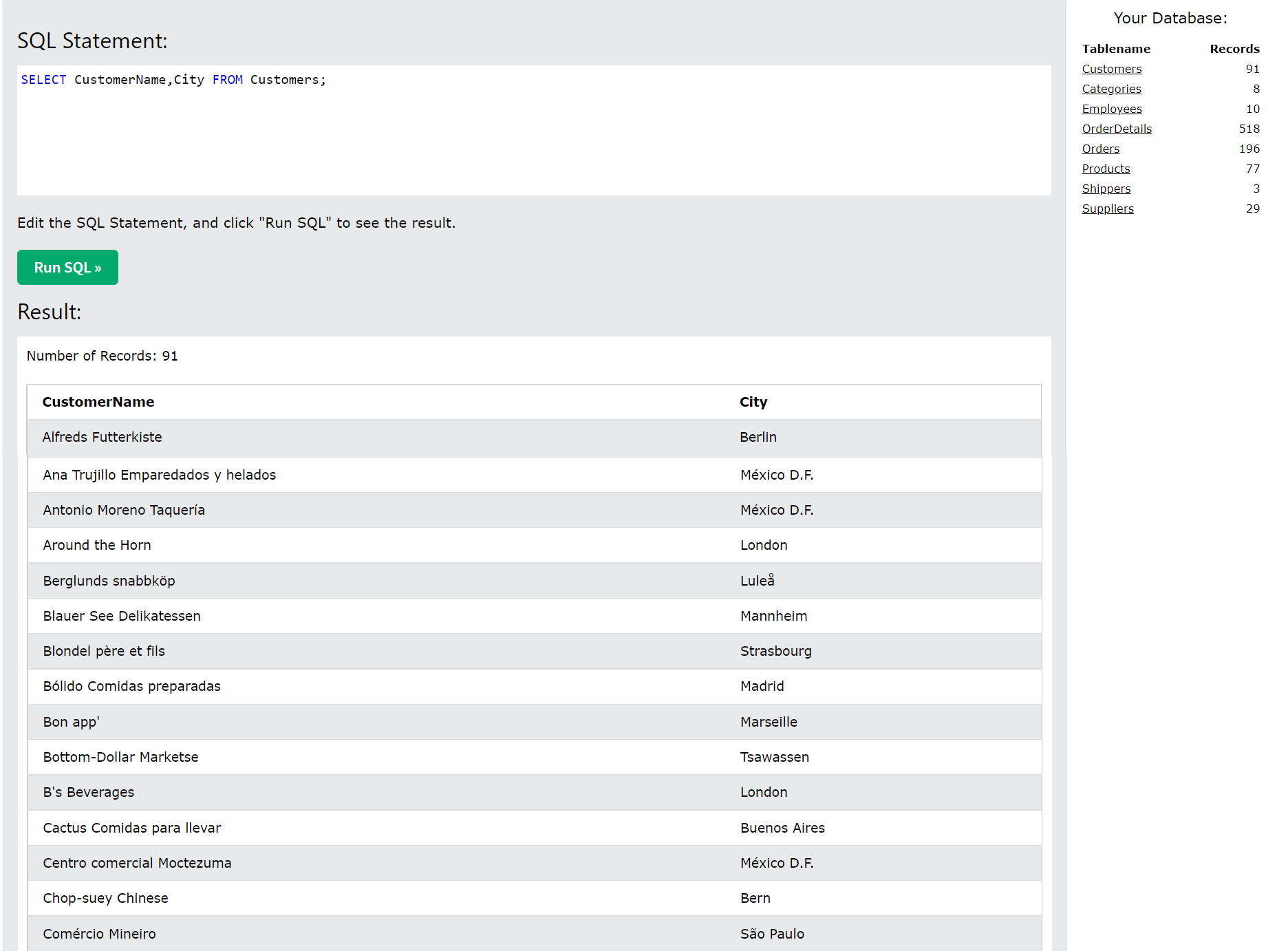 -> Customers 테이블에서 CustomerName 및 City 열을 선택